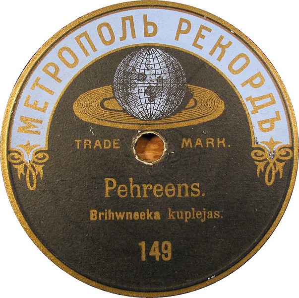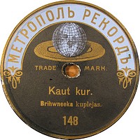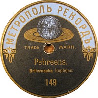 This record was pressed in Warsaw by a German company for the Latvian market. When this record was made, Latvia was part of Russia. This company stopped producing Russian records when WWI started. Only a couple years of production for the Russian/Latvian market on this label. Very rare. Enjoy!